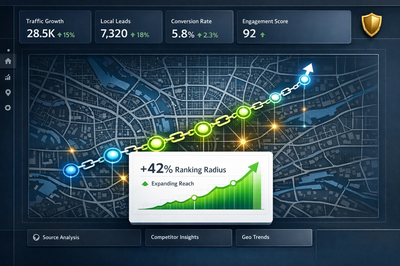 Traditional link building is often measured purely by Domain Rating (DR) and link volume. Regional source building should be measured by Ranking Radius (how far outside your physical location you rank in the map pack), Citation Readiness (how frequently generative AI answers recommend your brand), and the direct increase in highly qualified local organic traffic.